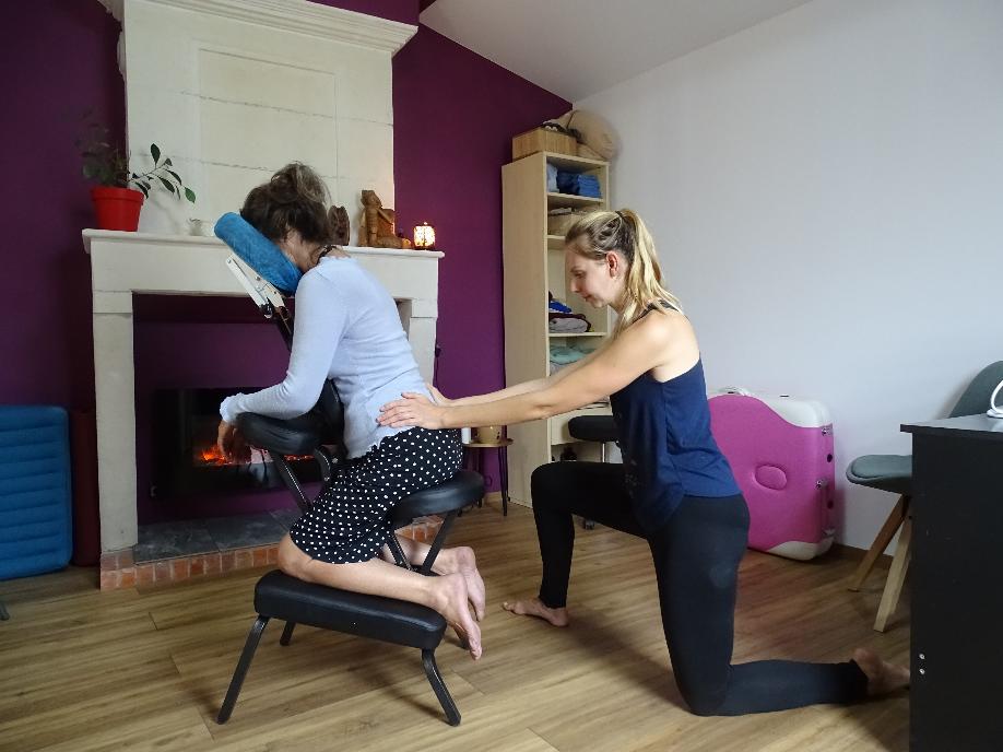 Cette technique habillée réalisée sur une chaise ergonomique, dénoue les tensions musculaires de la personne.